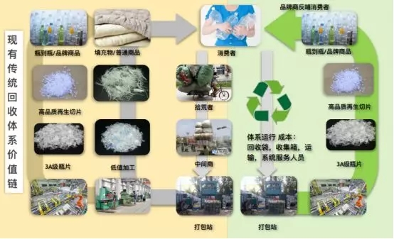 ????????在舊的PET價(jià)值鏈中,PET回收、分選和打包站,都是靠拾荒人群,沒(méi)有環(huán)保成本和對(duì)工人的保護(hù),物流效率低下,瓶片賣(mài)到化纖企業(yè),再生產(chǎn)品沒(méi)有很高附加值。而現(xiàn)在這種模式已經(jīng)難以為繼,品牌企業(yè)的加入,對(duì)于高品質(zhì)可追溯PET瓶的要求,城市垃圾分類(lèi),環(huán)保執(zhí)法,致使拾荒人群逐步消失,取而代之的是高品質(zhì)回收體系,回收+互聯(lián)模式的構(gòu)建,同時(shí)這也增加了回收系統(tǒng)的成本。用再靠賣(mài)給化纖工廠這些方式已經(jīng)不能的低端低值應(yīng)用,無(wú)法維持PET的價(jià)值鏈。