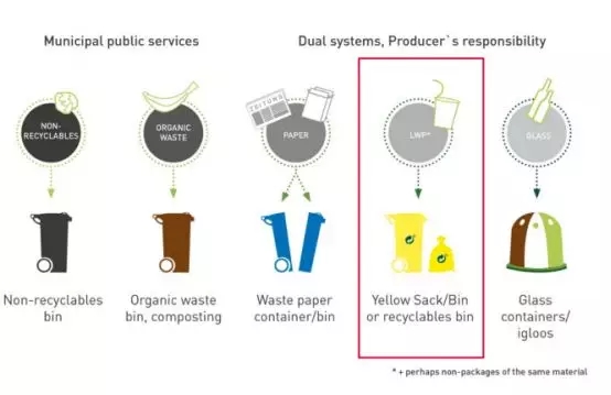 德國(guó)回收體系,黃色塑料袋收集的可回收垃圾(來(lái)源:德國(guó)綠點(diǎn)公司)