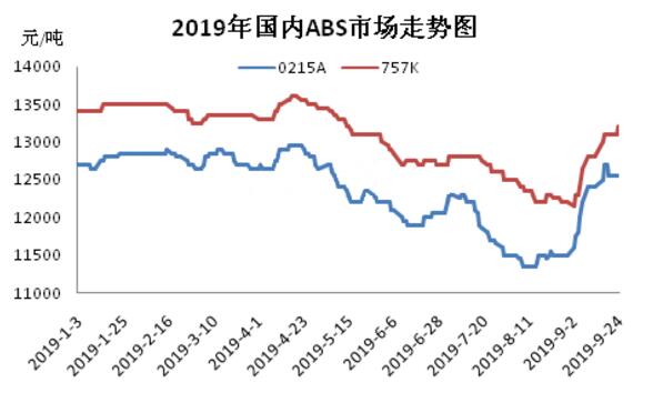 ????????2019年三季度,國(guó)內(nèi)ABS市場(chǎng)呈現(xiàn)出先抑后揚(yáng)的態(tài)勢(shì),以余姚市場(chǎng)吉化0215A為例,價(jià)格運(yùn)行區(qū)間在11350-12700元/噸。