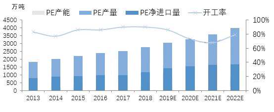 ????????PE國內(nèi)產(chǎn)能不斷擴增的同時,國際PE產(chǎn)能同樣快速增長,尤其近年來北美及中東地區(qū)以輕烴為原料的PE裝置快速投產(chǎn),我國是國際PE產(chǎn)品主要消費國,國際PE產(chǎn)品的主要消費目的地,導致我國PE進口量仍保持快速增長。近年PE進口依存度仍保持在50%左右。進口PE產(chǎn)品依托其成本價格優(yōu)勢,在國內(nèi)仍占有一席之地,預計PE進口依存度下降緩慢。2019年國內(nèi)PE表觀需求量預計在3270萬噸左右,產(chǎn)量將達到1745萬噸,進口量在1550萬噸左右,國內(nèi)PE進口依存度約在49%左右。隨著國內(nèi)PE新增產(chǎn)能陸續(xù)釋放,預計2020-2022年國內(nèi)PE裝置開工率或有所下降。