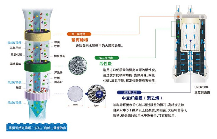 ????????通過聚丙烯棉、活性炭及中空纖維膜組成的三層過濾系統(tǒng),過濾后保留天然礦物質(zhì),為用家?guī)戆残摹⒆匀?、健康的飲用水?/p>