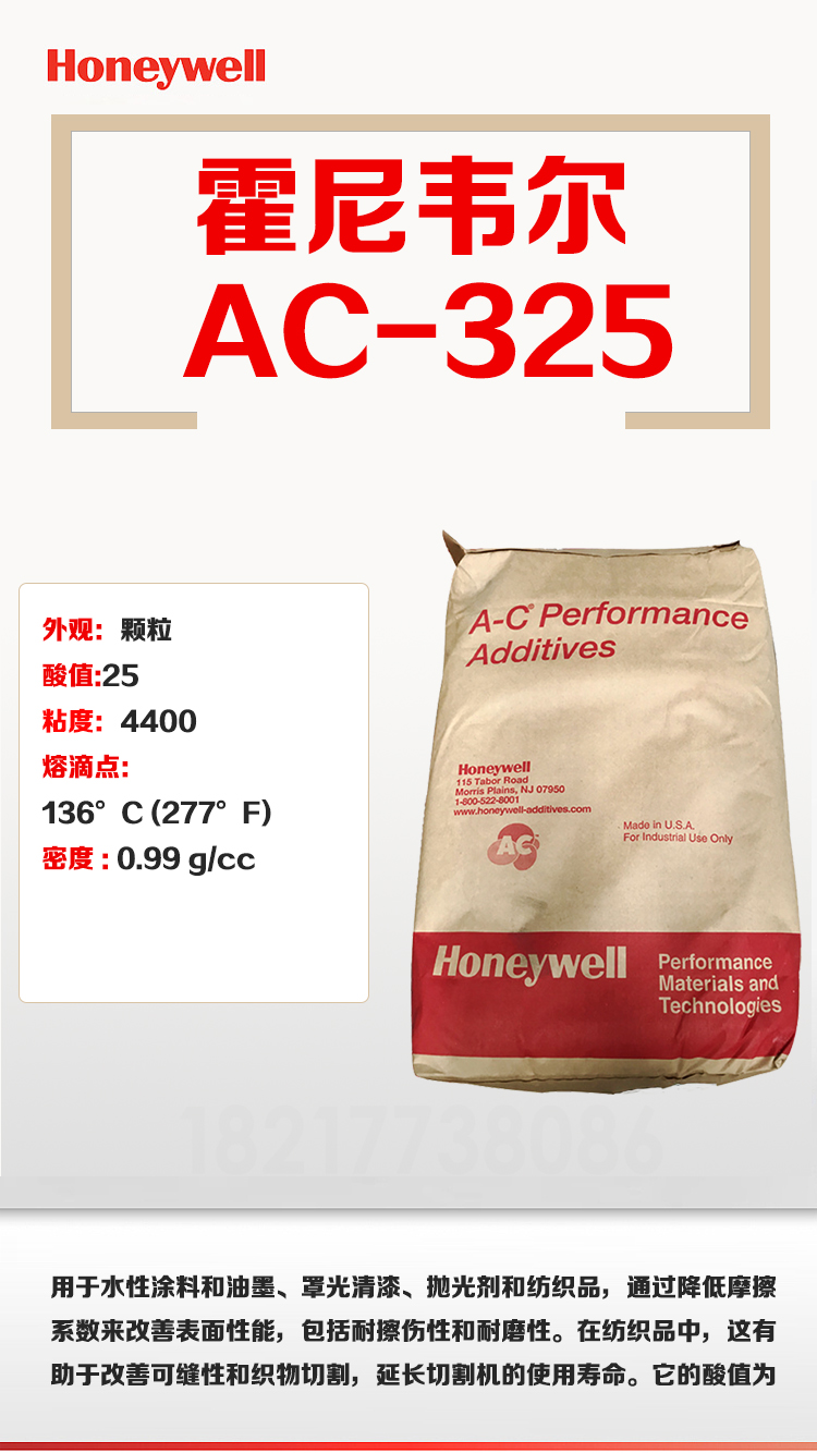 A-C325具有良好的氧化羧基官能團(tuán),與極性的PVC塑料部分相容性好,可以作為外滑劑;A-C?325另外一個(gè)重要功能是可被良好地乳化,適合于水性和油性產(chǎn)品;A-C?325還可以用來生產(chǎn)高性能的涂料防沉蠟漿,紡織品滑爽劑(牛仔布等材料) 、印花色漿、蠟乳液、地板拋光蠟、水果保鮮涂料和上光油等。
