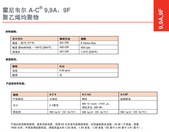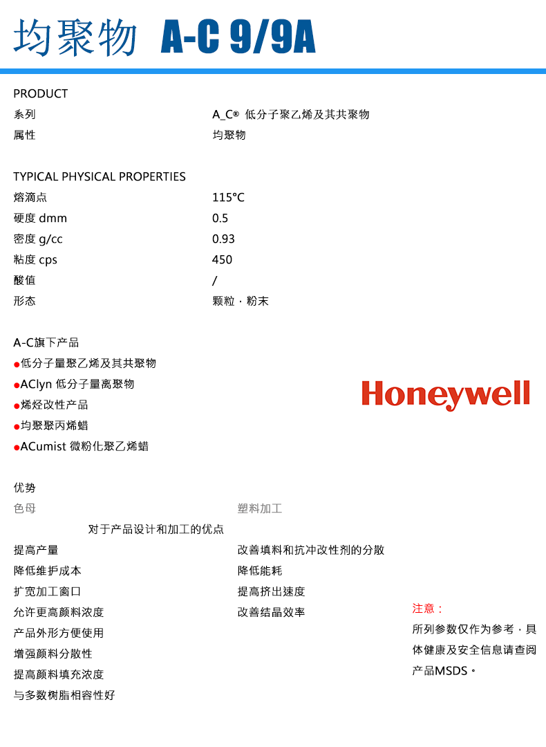 - 霍尼韋爾 A-C® 9A 低密度聚乙烯 (LDPE) 均聚物 物性表, 霍尼韋爾 A-C® 9A 低密度聚乙烯 (LDPE) 均聚物 產(chǎn)品參數(shù),霍尼韋爾 A-C® 9A 低密度聚乙烯 (LDPE) 均聚物 性能表,霍尼韋爾 A-C® 9A 低密度聚乙烯 (LDPE) 均聚物 出廠報(bào)告, MSDS,, 物質(zhì)安全資料表, UL黃卡,{ SGS報(bào)告, RoHS, 食品級認(rèn)證, NSF飲用水標(biāo)準(zhǔn), 產(chǎn)品資料, 產(chǎn)品性能, 出廠報(bào)告, 原廠原包, 代理商, 熱變形溫度, 熔指數(shù), 流動(dòng)系數(shù), 抗沖擊性能、沖擊強(qiáng)度, 低溫韌性、低溫抗沖擊性能, 熔體流動(dòng)系數(shù)、熔體流動(dòng)速率, 加工工藝、加工參數(shù)、加工溫度, 歐盟RoHS 德國FDA 美國FDA 日本FDA