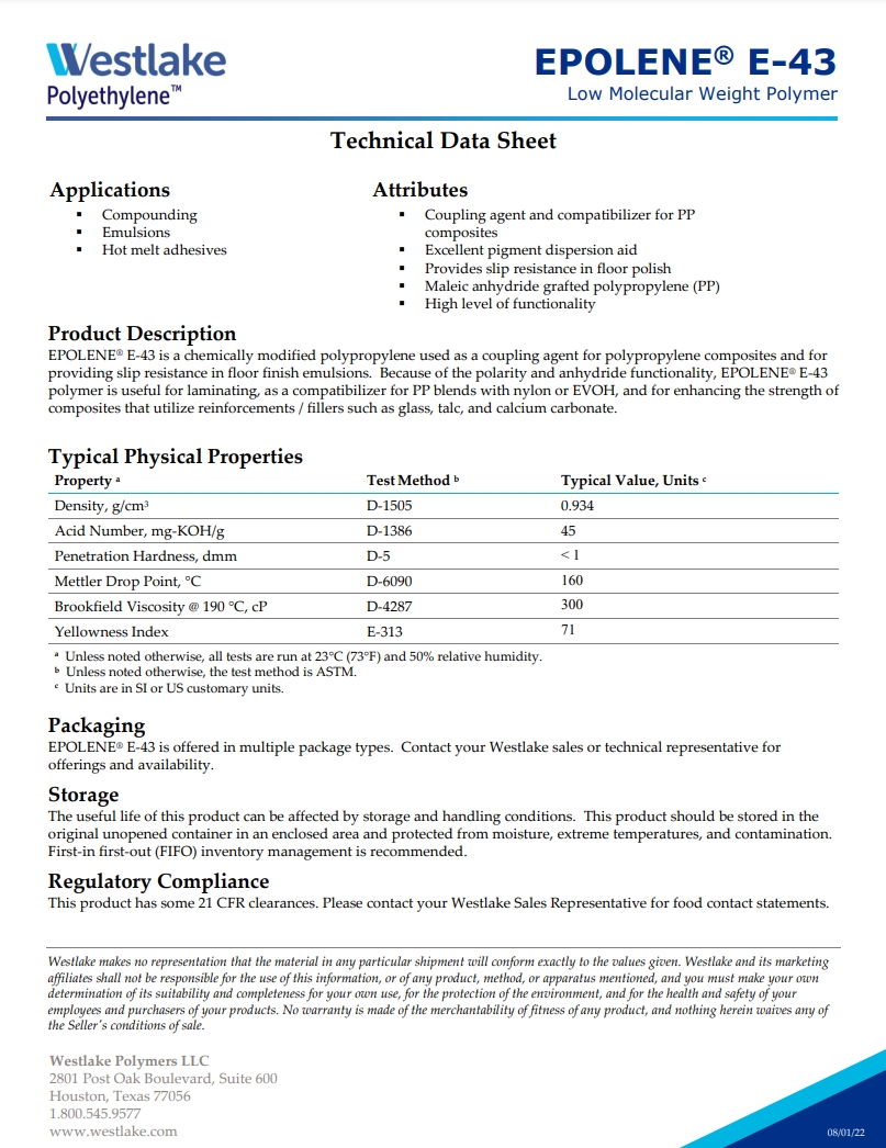 - 西湖化學 E43 Westlake酸酐接枝聚丙烯蠟 EPOLENE E-43 物性表, 西湖化學 E43 Westlake酸酐接枝聚丙烯蠟 EPOLENE E-43 產(chǎn)品參數(shù),西湖化學 E43 Westlake酸酐接枝聚丙烯蠟 EPOLENE E-43 性能表,西湖化學 E43 Westlake酸酐接枝聚丙烯蠟 EPOLENE E-43 出廠報告, MSDS,, 物質(zhì)安全資料表, UL黃卡,{ SGS報告, RoHS, 食品級認證, NSF飲用水標準, 產(chǎn)品資料, 產(chǎn)品性能, 出廠報告, 原廠原包, 代理商, 熱變形溫度, 熔指數(shù), 流動系數(shù), 抗沖擊性能、沖擊強度, 低溫韌性、低溫抗沖擊性能, 熔體流動系數(shù)、熔體流動速率, 加工工藝、加工參數(shù)、加工溫度, 歐盟RoHS 德國FDA 美國FDA 日本FDA
