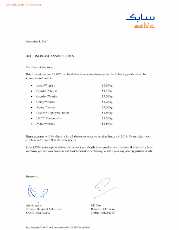 SABIC官方漲價函