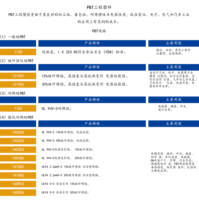 增強(qiáng)級1210G3 | 15%玻纖增強(qiáng),高強(qiáng)度及高抗熱變形電器性能佳。 | 適用于汽車、電子、電器等產(chǎn)業(yè)精密注塑用,如日光燈基座、省電燈泡用燈座、汽車之分電盤、汽車把手、燈座、風(fēng)扇外均、電器零件開關(guān)等。 |