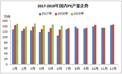 ????????據(jù)統(tǒng)計(jì),2019年上半年國內(nèi)PE產(chǎn)量在867.21萬噸,較2018年同期(802.68萬噸)增加64.53萬噸,增幅在8.04%。2019年上半年國內(nèi)PE石化大修裝置較少,開工率較高在92%-98%之間波動(dòng)。除此之外,內(nèi)蒙古久泰能源28萬噸/年全密度裝置在5月份順利投產(chǎn),6月份產(chǎn)量釋放產(chǎn)品逐步供應(yīng)市場(chǎng)。