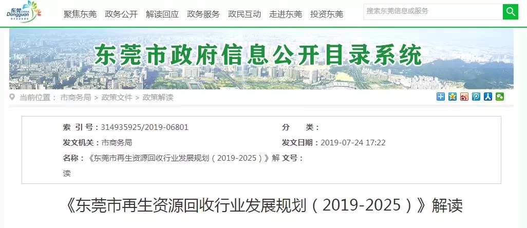 ????????7月24日,東莞市商務(wù)局對(duì)《東莞市再生資源回收行業(yè)發(fā)展規(guī)劃(2019-2025)》進(jìn)行解讀,進(jìn)一步規(guī)范再生資源回收行業(yè)發(fā)展