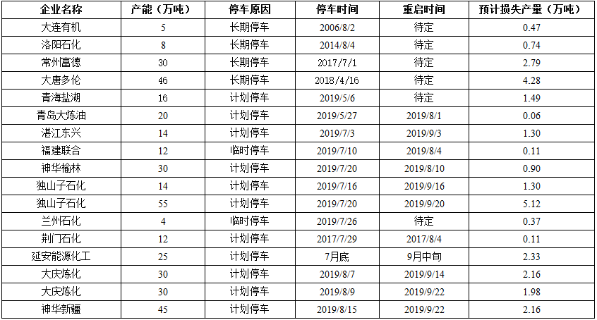8月份國內(nèi)聚丙烯計劃裝置檢修匯總